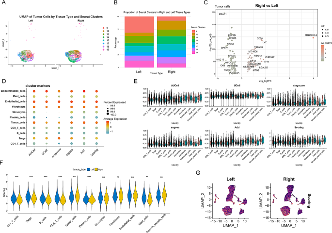 结果解读:右侧肿瘤细胞(p<0.01)和浆细胞(p<0.05)比例显著高于左侧,左侧Treg(p<0.05)和单核细胞(p<0.05)比例更高;肿瘤细胞亚群在左右侧分布差异明显,右侧肿瘤细胞亚群12、14、16、17更集中(图1)。