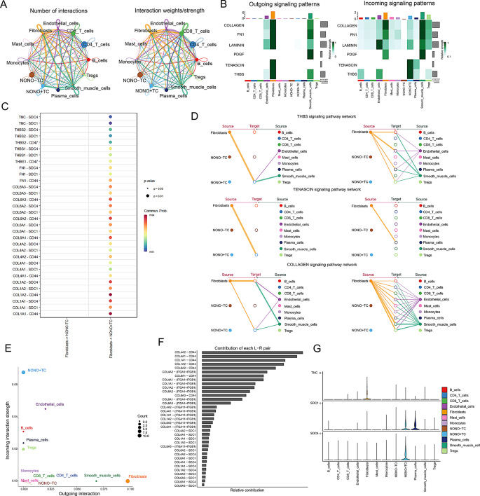 结果解读:成纤维细胞是TENASCIN、THBS信号的主要发送者,NONO⁺ TC是主要接收者;TENASCIN通路仅存在于NONO⁺ TC与成纤维细胞之间,是其特异性通讯通路;关键配体-受体对(如THBS1-ITGB1、COL1A1-SDC1)在两者中高表达,介导信号传递(图6)。