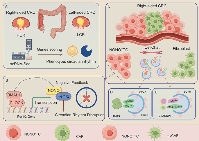 核心科学问题:NONO如何连接昼夜节律紊乱与右侧结直肠癌的促肿瘤成纤维细胞 crosstalk?