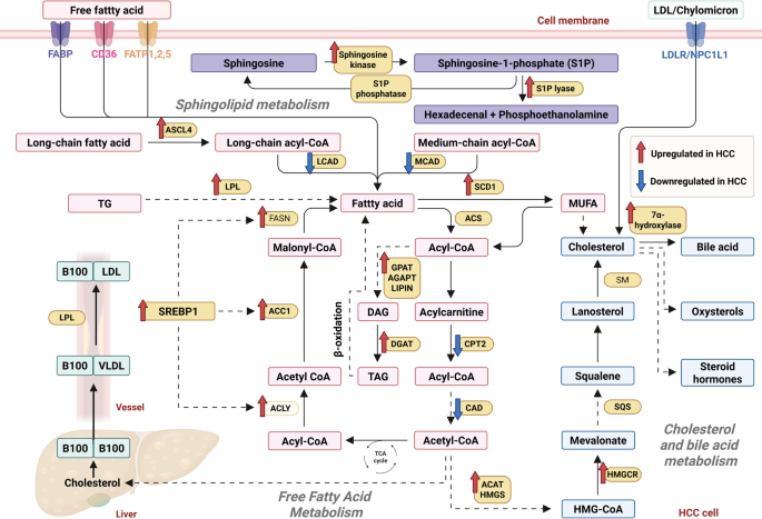 方法细节:分述游离脂肪酸、胆固醇、鞘脂代谢的关键酶及作用。例如,FASN、ACC1由c-MYC/SREBP1调控,促进从头脂肪合成;HMGCR由SREBP2调控,增加胆固醇酯积累;SphK1生成S1P,激活PI3K/AKT通路促进迁移。