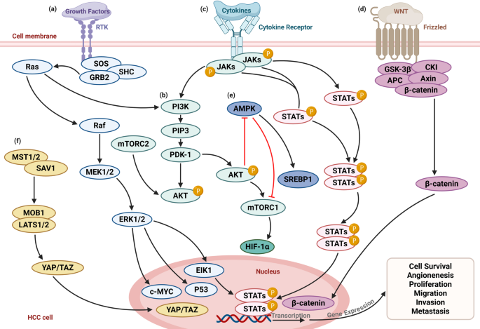 方法细节:综述PI3K/AKT/mTOR、Ras-Raf-MEK-ERK-cMYC、LKB1-AMPK、Wnt/β-catenin、Hippo-YAP/TAZ等信号通路与代谢酶的相互作用。例如,PI3K/AKT/mTOR通路通过激活c-MYC上调HK2、PKM2表达,促进糖酵解;Ras-Raf-MEK-ERK通路通过磷酸化ERK促进c-MYC转录,增强糖酵解基因表达;AMPK通路通过抑制SREBP1减少脂质合成。
