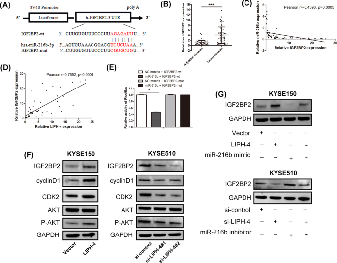 结果解读:生物信息学预测显示miR-216b与IGF2BP2 3"UTR存在结合位点(图5A);双荧光素酶报告实验验证miR-216b直接结合IGF2BP2(P<0.05,图5E);ESCC组织中IGF2BP2表达显著高于癌旁组织(P<0.05,图5B),与LIPH-4呈正相关(r=0.7552,P<0.0001,图5D),与miR-216b呈负相关(r=-0.4596,P=0.0005,图5C);过表达LIPH-4上调IGF2BP2、cyclinD1及p-AKT的表达,敲低则下调(图5F);共转染miR-216b模拟物可逆转LIPH-4过表达引起的IGF2BP2上调,共转染miR-216b抑制剂可逆转LIPH-4敲低引起的IGF2BP2下调(图5G)。