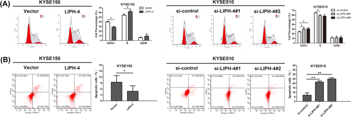 结果解读:ESCC细胞中LIPH-4表达均显著高于HET-1A细胞(P<0.05,图1D);过表达LIPH-4促进KYSE150细胞增殖(CCK-8、EdU及集落形成实验均显示增殖增强,P<0.05),敲低LIPH-4抑制KYSE510细胞增殖(P<0.05,图2);过表达LIPH-4促进细胞从G1期向S期transition,敲低则增加G0/G1期比例(P<0.05,图3A);过表达LIPH-4降低凋亡率,敲低则增加(P<0.05,图3B)。