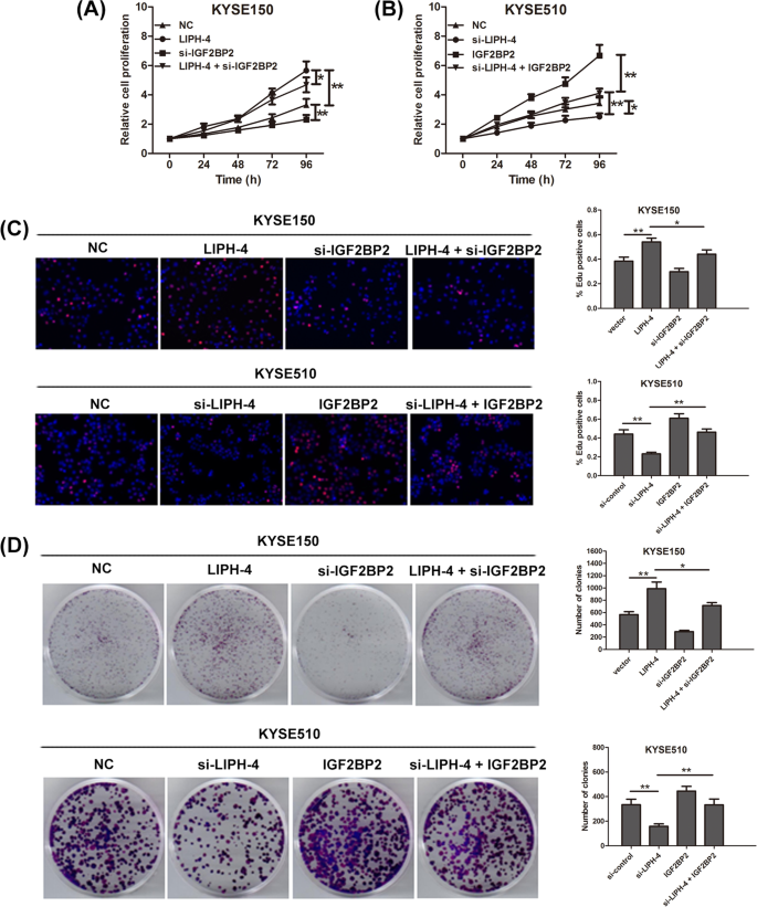 方法细节:在KYSE150细胞中过表达LIPH-4的同时敲低IGF2BP2,在KYSE510细胞中敲低LIPH-4的同时过表达IGF2BP2;采用CCK-8、EdU及集落形成实验检测细胞增殖能力的变化。