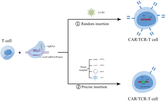 (图1:CRISPR介导的CAR-T基因KO/KI策略,显示随机整合与位点特异性KI的差异)