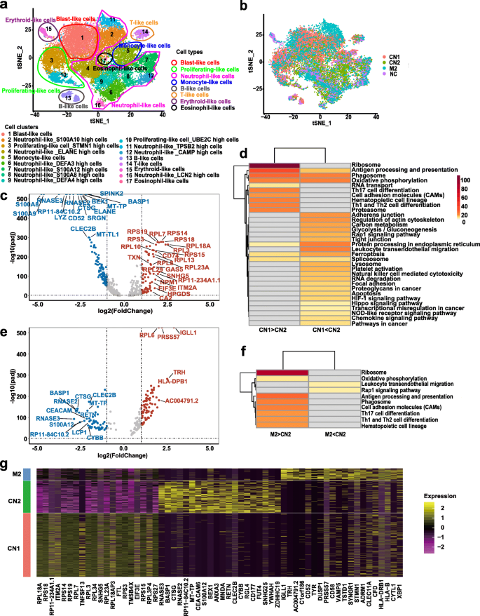 结果解读:共鉴定出17个细胞簇与8种细胞类型,其中“blast-like”细胞(高表达CD34、CD117)是白血病转化的关键群体。通过排除其他细胞类型干扰,作者将“blast-like”细胞作为后续差异基因分析的核心对象。