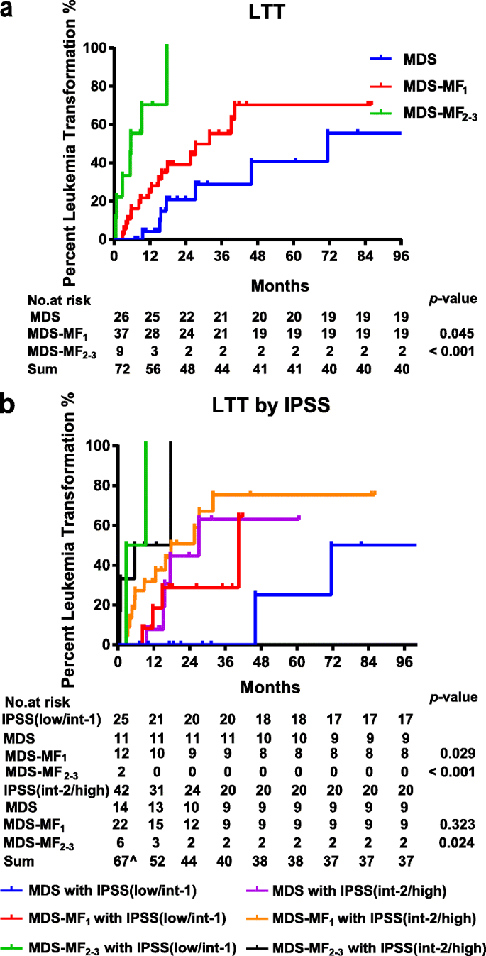 结果解读:三组患者的基线特征无显著差异,但MF2-3级组的不良核型率更高。生存分析显示,MDS组中位LTT为71.5个月,MF1组为31.9个月(n=44,p=0.045),MF2-3组为5.6个月(n=9,p<0.001);即使在IPSS低/中1危患者中,MF1组的中位LTT(40.4个月)仍显著短于MDS组(71.5个月,p=0.029)。这表明,轻度MF也会增加MDS患者的白血病转化风险,需早期干预。