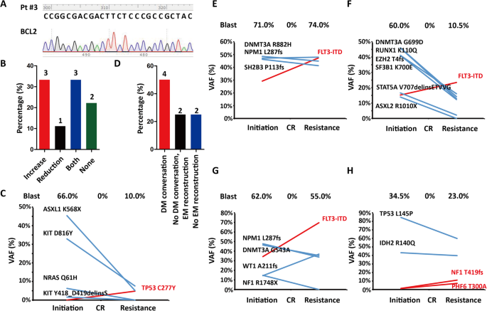 实验目的是验证现有突变的优势转换对维奈克拉耐药的介导作用。方法是分析优势突变(如FLT3-ITD)的VAF变化与临床耐药时间的相关性,并结合文献报道的FLT3-ITD对维奈克拉敏感性的影响。结果显示,FLT3-ITD扩增的患者(#3、#6、#7)均在FLT3-ITD成为主要突变后出现耐药,即使患者#5中未检测到FLT3-ITD,仍提示FLT3-ITD是AML中维奈克拉耐药的驱动因素;此外,优势突变转换的发生率(4/8)高于新突变(1/9),提示现有突变的重构比新突变更重要。实验所用关键产品:功能关联分析使用领域常规的生物信息学工具(如CNAcohort)。