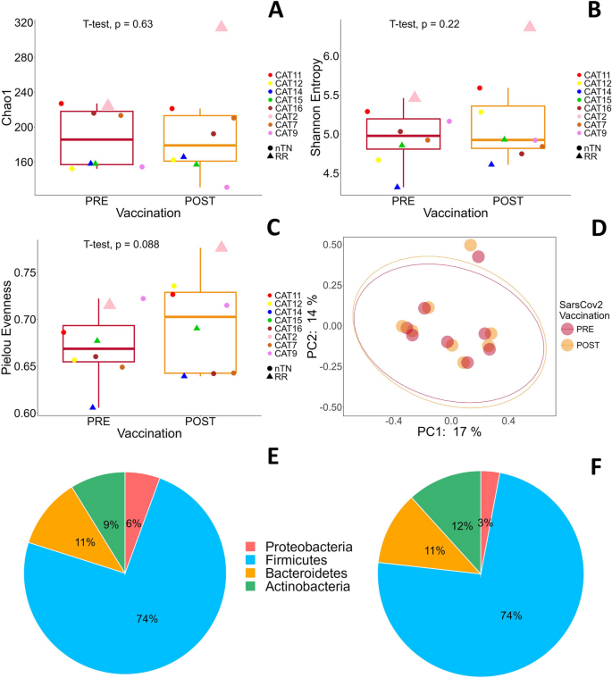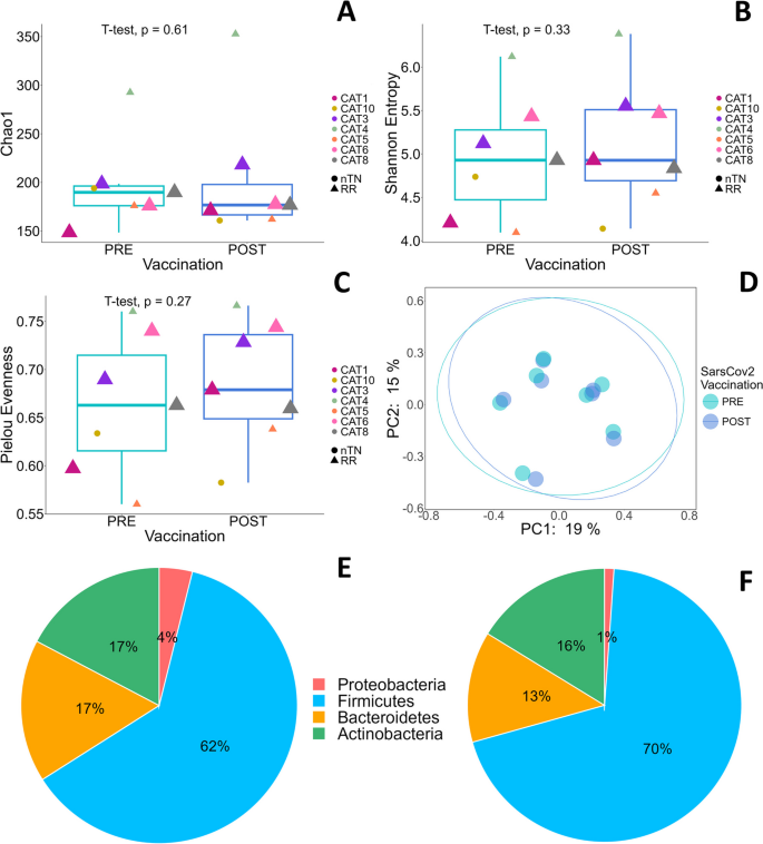结果解读:CLL患者(n=7)疫苗后,Firmicutes比例从62%增加至70%,Bacteroidetes从17%降至13%,Actinobacteria从17%降至16%,Proteobacteria从4%降至1%;FL患者(n=8)Firmicutes保持74%,Bacteroidetes保持11%,Actinobacteria从12%降至9%,Proteobacteria从6%降至3%。alpha多样性分析显示,CLL/FL患者疫苗前后Chao1(丰富度)、Shannon(多样性)指数无显著变化,但Pielou指数(均匀度)增加(提示微生物组均匀度改善)。beta多样性分析(Jaccard PCoA)显示,疫苗前后微生物组结构无显著聚类差异(PCoA图无分离)。差异属分析显示,CLL/FL患者疫苗后Collinsella、Gemmiger、Lachnospiraceae、Blautia、Ruminococcus、Lactobacillus属丰度增加,Faecalibacterium、Enterobacteriaceae、Enterococcus属丰度减少,但无统计学显著差异(p>0.05)。