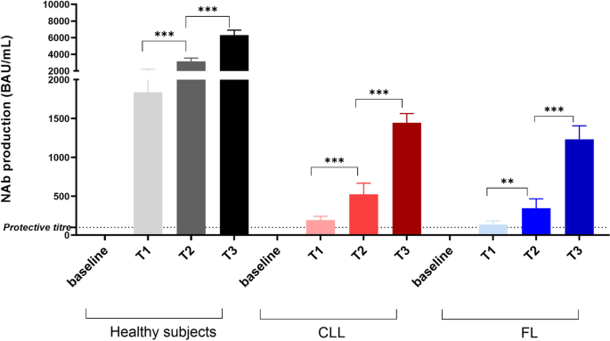 结果解读:CLL患者(n=19)第一针后抗体滴度为137±44 BAU/mL,FL患者(n=19)为194±48 BAU/mL,均显著低于健康对照(n=40)的1840±361 BAU/mL(p<0.001);第二针后,CLL患者滴度升至347±120 BAU/mL,FL患者升至524±144 BAU/mL,但仍低于健康对照的3161±381 BAU/mL(p<0.001);第三针后,完成booster的CLL患者(n=15)滴度为1234±171 BAU/mL,FL患者(n=15)为1445±119 BAU/mL,健康对照仍为6317±581 BAU/mL(p<0.001)。90%的无反应患者(18/20)在过去12个月内接受过抗CD20治疗,提示治疗史是体液免疫受损的关键因素。
