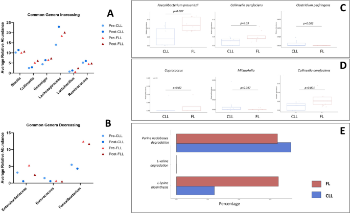 推测:Collinsella、Gemmiger等短链脂肪酸产生菌的增加,可能通过调节肠道Treg细胞分化或细胞因子分泌,改善CLL/FL患者的疫苗免疫反应,但需进一步的机制研究验证。