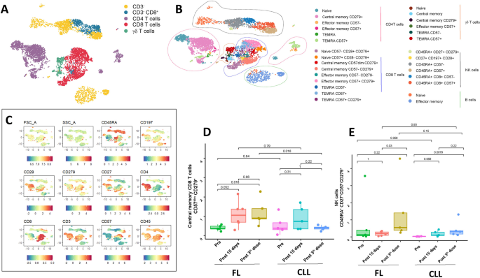 核心结果:FL患者的CD8+CD57dimCD279+中心记忆T细胞比例在疫苗后增加(p=0.05),可能与细胞免疫保护相关;CLL/FL患者的CD45RA+CD27+CD279+CD57- NK细胞比例在疫苗后扩张(CLL:p=0.03;FL:p=0.0079),可能是疫苗诱导的细胞免疫补偿机制;CLL患者的Myeloid-1中性粒细胞亚群减少(p=0.007),提示疫苗对髓系细胞的调节作用。