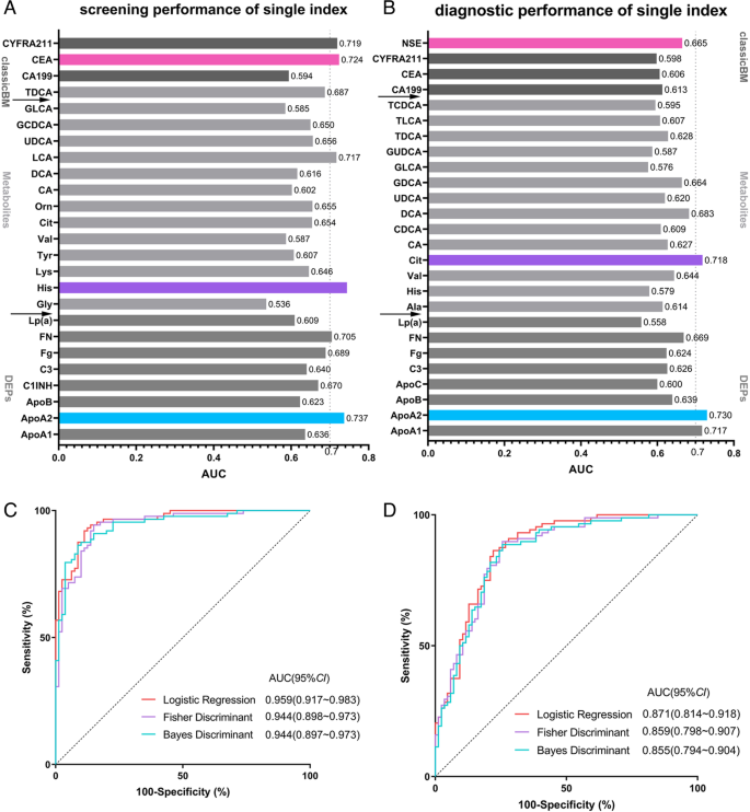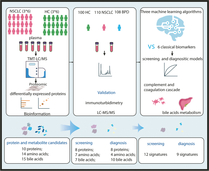 现有研究的不足包括:① 多聚焦单一组学(如仅蛋白质或仅代谢物),整合分析较少;② 部分研究样本量小,缺乏BPD对照组,导致诊断特异性不足;③ 未系统结合经典肿瘤标志物,难以直接应用于临床。本研究的创新点在于:① 采用TMT-LC-MS/MS技术规模化筛选NSCLC血浆差异蛋白,结合通路分析定向选择代谢物(氨基酸、胆汁酸);② 纳入110例NSCLC患者、108例BPD患者及100例健康对照的大样本,覆盖筛查(NSCLC vs HC)与鉴别诊断(NSCLC vs BPD)场景;③ 利用逻辑回归、Fisher判别等机器学习算法,整合蛋白、代谢物与经典标志物,建立高性能诊断模型。