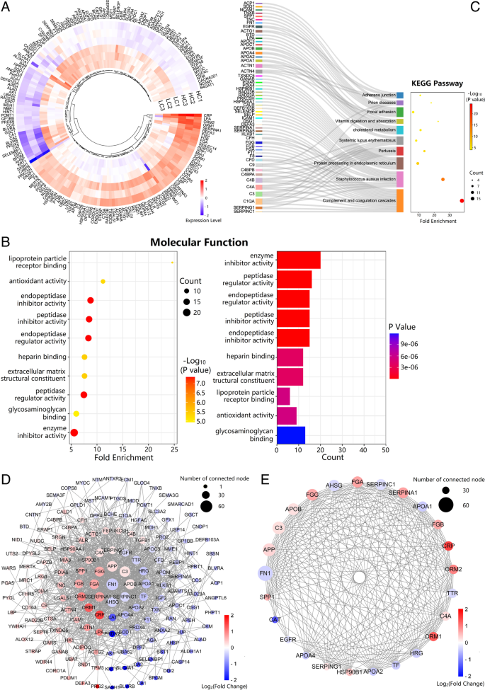 结果解读:共鉴定到942个可定量蛋白,其中180个DEPs(77个上调,103个下调);GO分析显示差异蛋白的分子功能主要富集于“脂蛋白颗粒受体结合”,KEGG通路主要富集于“补体与凝血级联”“胆固醇与胆汁酸代谢”;PPI网络分析筛选出25个hub基因(如ApoA1、ApoB、C3等)。