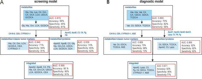 - 性能优势:整合模型显著优于单一组学模型。例如,筛查场景中,蛋白单组学模型AUC为0.796,代谢物单组学模型AUC为0.915,整合模型AUC提升至0.96;诊断场景中,蛋白单组学模型AUC为0.750,代谢物单组学模型AUC为0.800,整合模型AUC提升至0.871。