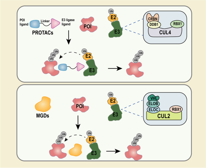 - PROTACs:异双功能分子,由E3泛素连接酶配体、靶蛋白(POI)配体及连接链(linker)组成,通过形成“POI-PROTAC-E3”三元复合物介导靶蛋白泛素化降解。常用E3连接酶包括cereblon(CRBN)和Von Hippel-Lindau蛋白(VHL),其中CRBN因与免疫调节药物(IMiDs)的结合特性,成为MM、淋巴瘤中降解IKZF1/3(锌指转录因子)的关键媒介;VHL则因在血小板中低表达,可减少BCL-XL降解导致的血小板毒性(如PROTAC DT-2216)。