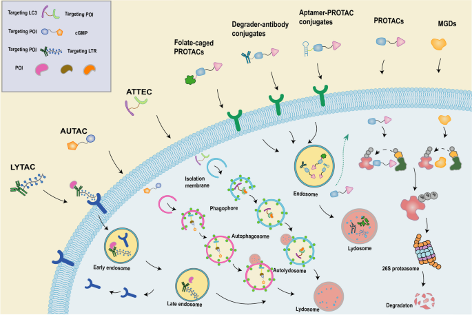 图5:新型TPD技术的机制——包括PROTAC-抗体偶联物(DACs)、叶酸笼PROTACs、溶酶体途径技术(LYTACs)等。
