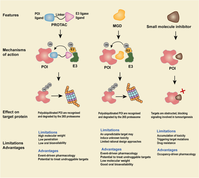 图1:TPD技术(PROTACs、分子胶)与小分子抑制剂的机制对比——TPD通过降解靶蛋白发挥作用,小分子通过占据靶点抑制活性。