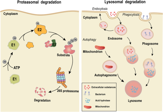 方法细节:综述UPS的作用流程(E1激活泛素→E2结合泛素→E3将泛素转移至POI→形成多聚泛素链→26S蛋白酶体降解);溶酶体途径的作用方式(通过内吞降解细胞外蛋白、通过自噬降解细胞内受损细胞器)。