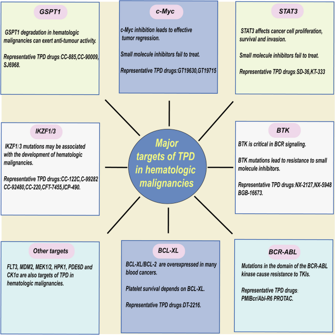 图4:血液肿瘤中的主要TPD靶点——包括IKZF1/3、GSPT1、BTK、c-Myc等。