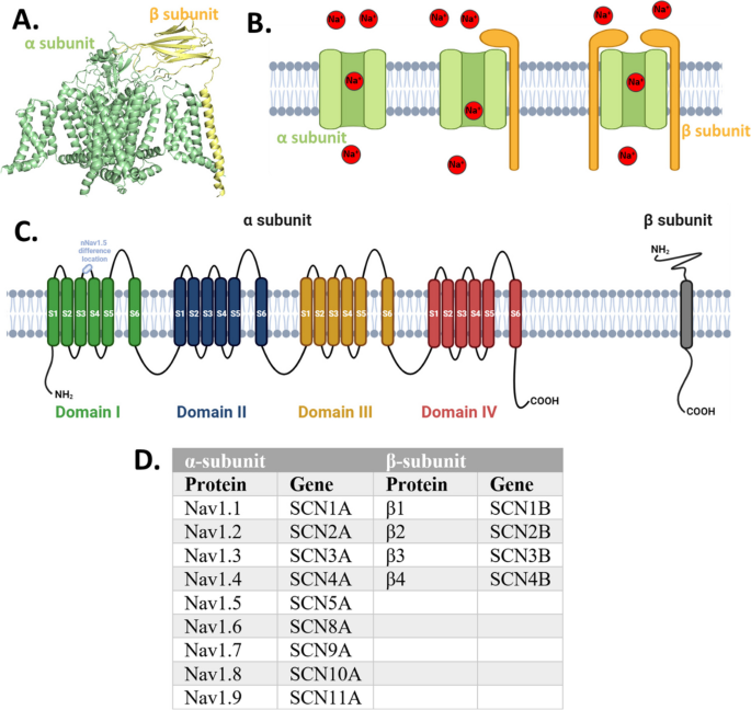 (Fig1展示VGSCs的结构:α亚基的四域结构与β亚基的辅助功能,为后续功能分析提供分子基础)