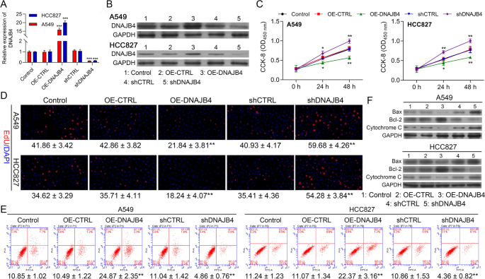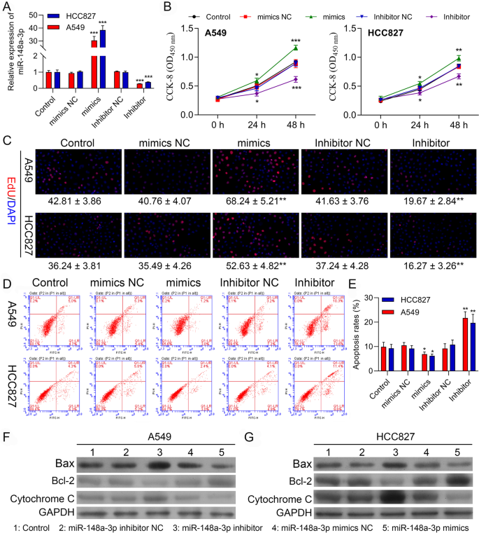 实验目的:探究miR-148a-3p对NSCLC细胞增殖和凋亡的作用。方法:合成miR-148a-3p mimic和inhibitor,转染A549和HCC827细胞;采用CCK-8、EdU实验检测增殖;流式细胞术检测凋亡;Western blot检测凋亡相关蛋白。结果:转染miR-148a-3p mimic显著促进细胞增殖(CCK-8:P<0.01;EdU:P<0.001),抑制凋亡(流式:P<0.01);转染miR-148a-3p inhibitor则相反。Western blot结果显示,miR-148a-3p mimic下调Bax和Cytochrome C的表达,上调Bcl-2的表达(P<0.01)。产品关联:miR-148a-3p mimic和inhibitor由GenePharma合成。