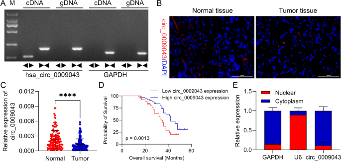 circ_0009043是一种定位于细胞质的circRNA,作为NSCLC的组织学预后生物标志物。筛选/验证逻辑:首先通过132对NSCLC临床样本的qRT-PCR检测,发现circ_0009043在肿瘤组织中低表达;随后通过FISH验证其细胞定位;接着通过Kaplan-Meier生存分析确认其与患者预后的关联;最后通过临床病理关联分析验证其与肿瘤进展的关系。