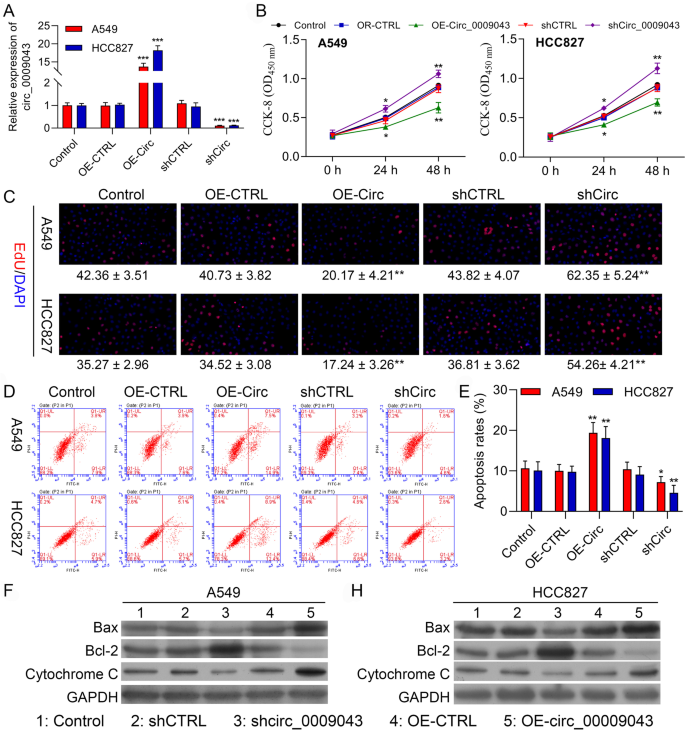 实验目的:探究circ_0009043对NSCLC细胞增殖和凋亡的调控作用。方法:构建circ_0009043过表达载体(pcDNA4.0-circ_0009043)和敲低载体(sh-circ_0009043),转染NSCLC细胞系A549(低表达circ_0009043)和HCC827(高表达circ_0009043);采用CCK-8法和EdU掺入实验检测细胞增殖能力;通过流式细胞术(Annexin V-FITC/PI双染)检测细胞凋亡率;Western blot检测凋亡相关蛋白(Bax、Bcl-2、Cytochrome C)的表达。结果:过表达circ_0009043显著抑制A549和HCC827细胞的增殖(CCK-8:P<0.01;EdU:P<0.001),并促进细胞凋亡(流式:P<0.01);敲低circ_0009043则相反。Western blot结果显示,过表达circ_0009043上调促凋亡蛋白Bax和Cytochrome C的表达,下调抗凋亡蛋白Bcl-2的表达(P<0.01)。产品关联:转染试剂为Lipofectamine 2000(Invitrogen);CCK-8试剂购自Sigma-Aldrich;EdU试剂盒购自Ribobio;Western blot抗体:Bax(Boster,货号BA0315-2)、Bcl-2(Boster,货号A00040-1)、Cytochrome C(Abcam,货号ab133504)、GAPDH(Boster,货号BA2913)。