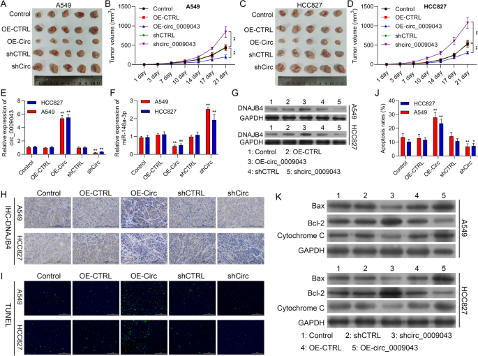 实验目的:验证circ_0009043在体内对NSCLC肿瘤生长的调控作用。方法:将过表达或敲低circ_0009043的A549细胞皮下接种于裸鼠(n=6/组),每周测量肿瘤体积;4周后处死裸鼠,称量肿瘤重量;qRT-PCR检测肿瘤组织中circ_0009043和miR-148a-3p的表达;Western blot和免疫组化(IHC)检测DNAJB4的表达;TUNEL实验检测肿瘤细胞凋亡。结果:过表达circ_0009043显著抑制肿瘤生长(体积:P<0.01;重量:P<0.001),敲低circ_0009043则促进肿瘤生长;qRT-PCR结果显示,过表达circ_0009043下调miR-148a-3p的表达(P<0.001),敲低则上调;Western blot和IHC结果显示,过表达circ_0009043上调DNAJB4的表达(P<0.01),敲低则下调;TUNEL实验显示,过表达circ_0009043促进肿瘤细胞凋亡(P<0.001),敲低则抑制。产品关联:裸鼠购自Vital River Laboratories;IHC抗体为DNAJB4(Abcam,货号ab254641);TUNEL试剂盒购自Beyotime(货号C1089)。