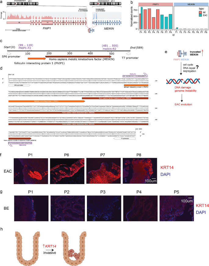 KRT14的来源为8例患者的BE和EAC组织,验证方法为免疫荧光染色,结果显示EAC组织中KRT14的荧光强度显著高于BE(样本量n=8,文献未提供具体P值,但视觉差异明显);FNIP1-MEIKIN融合的来源为Patient 1的EAC组织,验证方法为RT-PCR和纳米孔测序,结果显示该融合仅存在于EAC中,未在配对BE中检测到(n=1,P值未明确),且MEIKIN的表达水平在EAC中显著升高(图2b)。