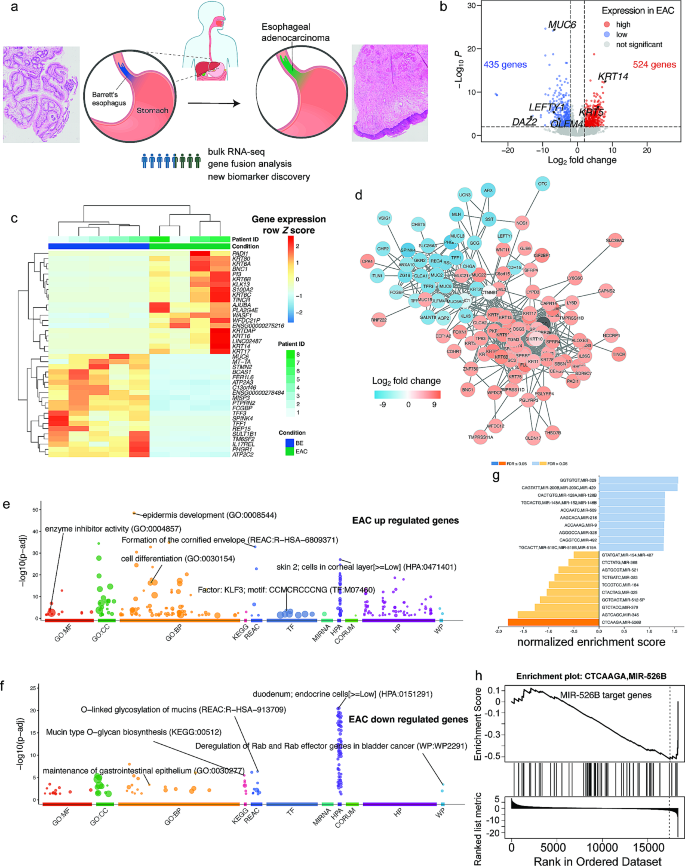 实验目的是获取BE和EAC组织的转录组数据,为后续差异分析奠定基础。方法细节为收集8例患者的BE和EAC配对组织,提取总RNA后进行RNA-seq(Illumina平台,具体测序参数未提及)。结果解读:通过差异基因表达分析(以log₂倍数变化(FC)和调整后P值为标准),鉴定出524个在EAC中显著上调的基因和435个显著下调的基因(图1b),其中角质蛋白家族(如KRT14)、黏蛋白基因(如MUC5B)为关键差异基因。实验所用关键产品:文献未提及具体实验产品,领域常规使用RNA提取试剂盒(如Qiagen RNeasy Mini Kit)、RNA-seq文库构建试剂盒(如Illumina TruSeq Stranded mRNA Library Prep Kit)。