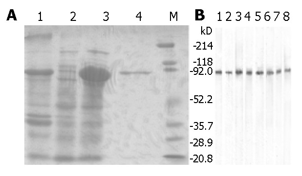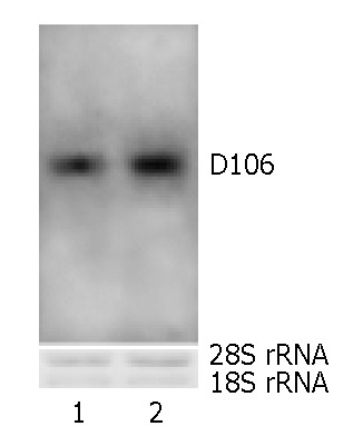 实验目的是验证Amb a 8(D106)的RNA来源及重组蛋白的过敏原性。方法包括:(1)Northern blot验证RNA来源:提取花萼/花梗与花粉的总RNA,经甲醛凝胶电泳后转移至尼龙膜,用Psoralen-biotin标记的D106探针杂交,通过Phototope star检测 kit(Ambion)显影;(2)重组蛋白表达:将表达载体转化BL21(DE3)感受态细胞,用0.5 mmol/L IPTG诱导2 h(30℃),通过150 g/L SDS-PAGE分析表达情况;(3)免疫印迹(Western blot)验证过敏原性:用S·Tag thrombin purification kit(Novagen)纯化重组蛋白,经SDS-PAGE转移至PVDF膜,用过敏患者血清(n=8,IgE>3.5 kU_A/L)孵育后,加入辣根过氧化物酶标记的羊抗人IgE(Sigma-Aldrich),DAB显色底物(Amersco)显影。结果显示:Northern blot中花粉与花萼/花梗RNA均出现杂交条带(图4),证明D106的RNA真实来源;重组蛋白分子量约70 kDa(与预期一致),且能与过敏患者血清IgE结合(图6),而正常对照血清(n=13)无反应,证明其过敏原性。实验所用关键产品:S·Tag thrombin purification kit(Novagen)、peroxidase conjugated goat anti-human IgE(Sigma-Aldrich)、DAB chromogenic substrate solution(Amersco)。