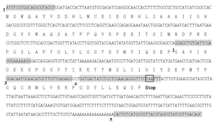实验目的是获取短豚草(Ambrosia artemisiifolia L.)花粉过敏原基因的5’端与3’端片段。方法为:采集短豚草花粉,液氮研磨后用RNeasy Maxi kit(Qiagen)提取总RNA,通过ProtoScript first strand cDNA synthesis kit(New England Biolabs)将2μg总RNA反转录为cDNA;利用泛简并引物PCR(引物Sg1P5/S3D10)扩增5’端片段A,通过快速cDNA末端扩增(RACE)技术(引物S5D106/RAC3)获取3’端片段B。结果显示,片段A长度为363 bp,片段B为431 bp,两者存在126 bp的同源区域,为后续BPCR拼接全长基因提供了关键序列基础。实验所用关键产品:RNeasy Maxi kit(Qiagen)、ProtoScript first strand cDNA synthesis kit(New England Biolabs)。