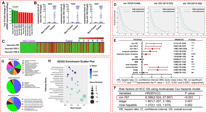 结果解读:① 生存分析显示,mir-767-105簇的3个成员高表达均与HCC患者不良预后显著正相关(高表达组总生存期显著短于低表达组,P<0.05);② 索拉非尼耐药组中,3个成员的表达均显著高于敏感组(P<0.05、0.01或0.001);③ Cox分析显示,3个miRNA均为独立预后因素(与病毒肝炎、肿瘤分期等临床因素无显著相关性),其中mir-767的风险比(HR)最高(8.388,95%CI 2.524–27.897,P<0.05),提示其对预后的调控作用最强。