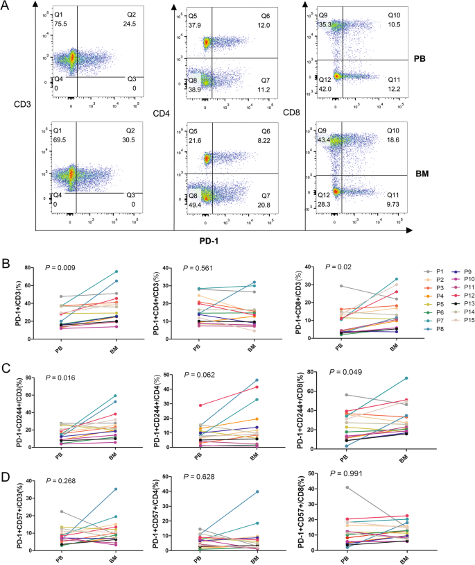 图1 AML患者外周血与骨髓中PD-1+T细胞的分布差异(A:流式检测结果;B-D:各亚群比例对比)