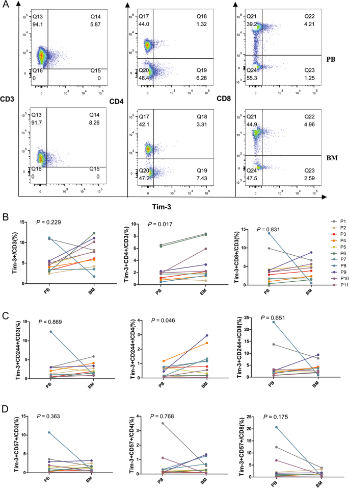 图2 AML患者外周血与骨髓中Tim-3+T细胞的分布差异(A:流式检测结果;B-D:各亚群比例对比)