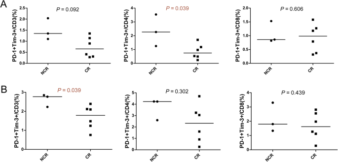 实验目的是探讨PD-1+Tim-3+T细胞比例与化疗缓解率的关系。方法细节:对9例化疗患者进行Mann-Whitney U检验,比较CR与NCR组骨髓与外周血中PD-1+Tim-3+亚群的比例。结果解读:(1)外周血:NCR组PD-1+Tim-3+CD4+T细胞比例(中位数1.5%)显著高于CR组(0.6%,P<0.05,如图4A所示);(2)骨髓:NCR组PD-1+Tim-3+CD3+T细胞比例(中位数2.1%)显著高于CR组(1.0%,P<0.05,如图4B所示)。