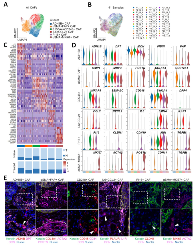 - 鉴定出与治疗耐药相关的CAFs亚型(CD248+机械响应CAFs、IL6+CCL2+免疫调节CAFs);