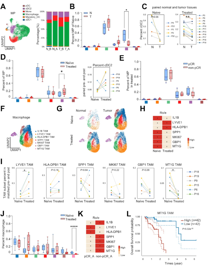 - 单核吞噬细胞中,MT1G+M2巨噬细胞(促肿瘤)在non-pCR组富集(P<0.05),与不良预后相关(TCGA生存分析P=5.02e-05);