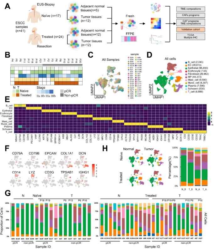 方法细节:纳入18例ESCC患者,收集41份样本(17份治疗前内镜活检,24份治疗后手术切除),其中6例为配对样本;样本经sCelLive™组织保存液保存,酶解成单细胞悬液(用Singleron PythoN™组织解离系统),通过10x Genomics平台进行scRNA-seq;数据过滤标准:基因数200-前2%、UMI数前2%、线粒体含量<50%。