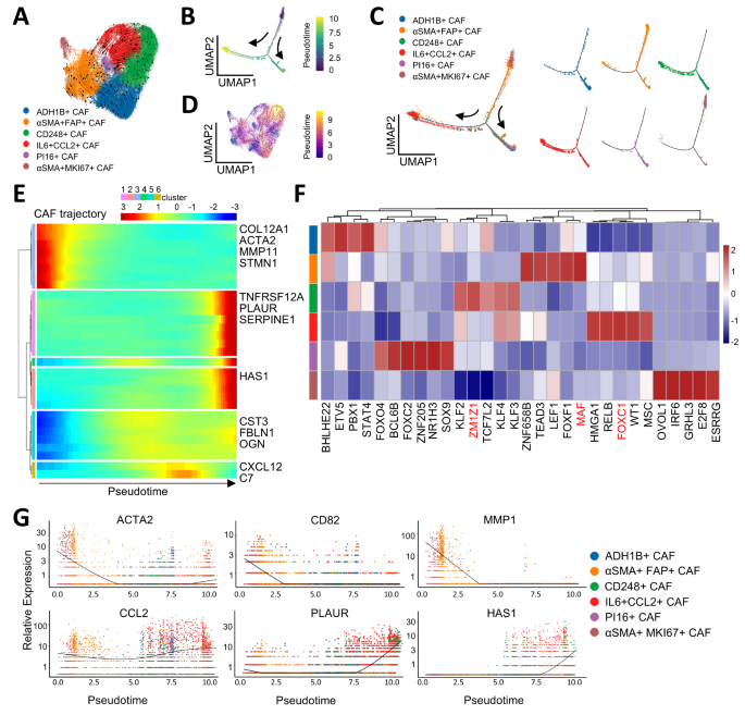 方法细节:对26962个成纤维细胞进行无监督聚类;基于差异基因表达(如ADH1B、CD248、IL6)和GO分析(ECM组织、炎症反应)定义亚型;用Monocle2/3进行轨迹分析,鉴定CAFs的分化路径;用转录因子(TF)分析解析调控网络。