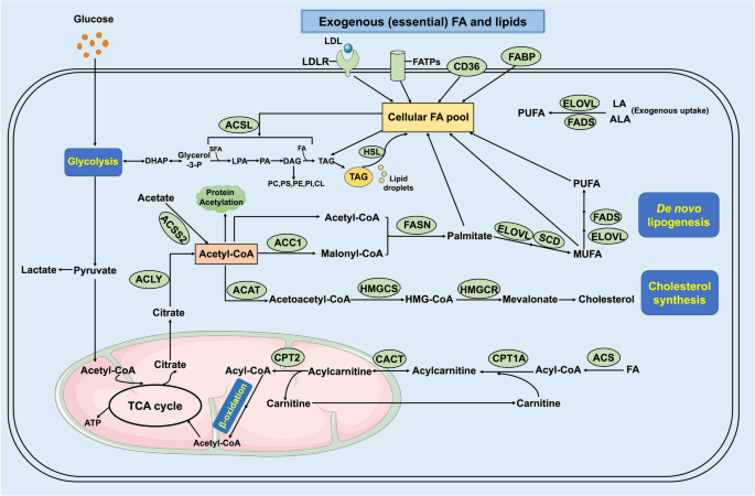 肿瘤细胞的脂质需求通过外源性摄取(CD36/FATPs摄取LCFAs、LDLR摄取胆固醇)和从头合成(ACLY→ACC1→FASN通路生成脂肪酸,HMGCR通路生成胆固醇)满足(Fig1)。即使外源性脂质充足,肿瘤仍偏好从头合成——这一特征是肿瘤代谢重编程的核心,也是治疗干预的关键靶点。