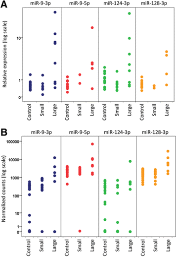 3. Applied Biosystems定量PCR(qPCR):Norgen Biotek Total RNA Purification Kit提取200μl CSF RNA,TaqMan MicroRNA Reverse Transcription Kit反转录,TaqMan PreAmp Master Mix预扩增,24个候选miRNA在BioMark系统(Fluidigm)上验证;以miR-320a为内参计算REL。