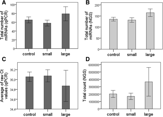 实验目的是探讨miRNAs总量与梗死灶大小的关系。方法细节:统计qPCR/NGS检测的miRNA总数,计算平均原始Ct值(qPCR)、总测序计数(NGS)。结果解读:大梗死灶患者的miRNA总数(qPCR/NGS)均高于小梗死灶及对照组,提示脑损伤导致CSF中miRNAs释放增加。图片插入: