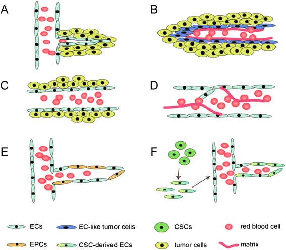(图1:肿瘤血管生成机制示意图,展示VM与芽生血管、血管共生等方式的区别)。
