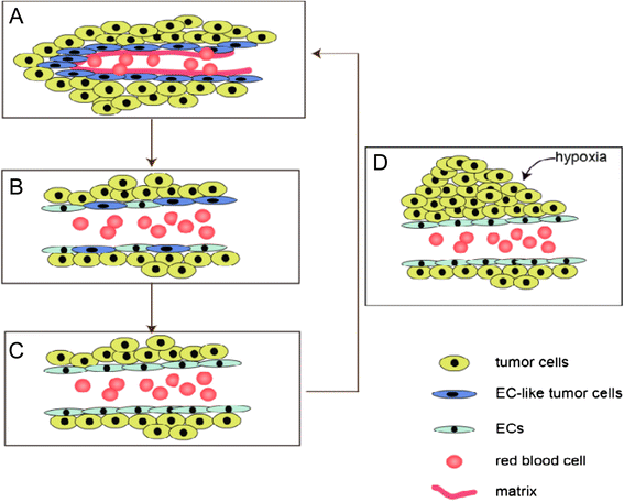 (图2:肿瘤血供模式的三个阶段,展示VM通道向内皮依赖血管的转化)。