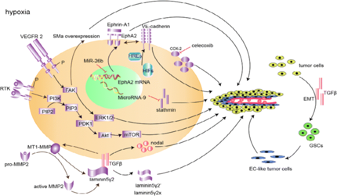 现有研究的关键结论包括:① VM是GBM中独立于内皮细胞的血管网络,由肿瘤细胞通过胚胎样表型和可塑性形成,与患者不良预后正相关;② GSCs通过上皮-间质转化(EMT)获得多向分化能力,是VM的关键细胞来源;③ TGFβ、VEGFR-2、VE-钙黏蛋白/EphA2、PI3K/Akt/mTOR、MMP-层粘连蛋白5γ2链等通路协同调控VM;④ 缺氧是VM的早期诱导因素,通过缺氧诱导因子(HIF)调控VM相关分子表达。