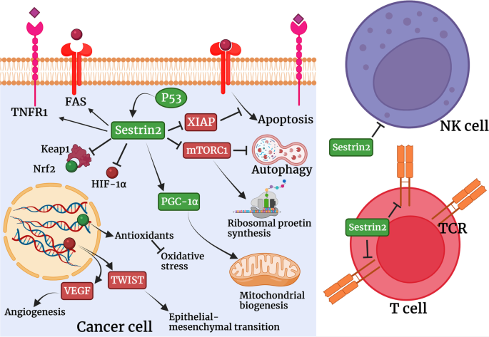 本综述首次系统整合了Sestrin2与氧化应激、自噬、炎症、免疫等多个细胞过程的相互作用,清晰梳理了其在不同癌症中的“抑癌-促癌”双重角色,为解决现有研究的矛盾提供了框架——Sestrin2的作用依赖于肿瘤微环境(如营养状态、免疫压力)与癌症类型。