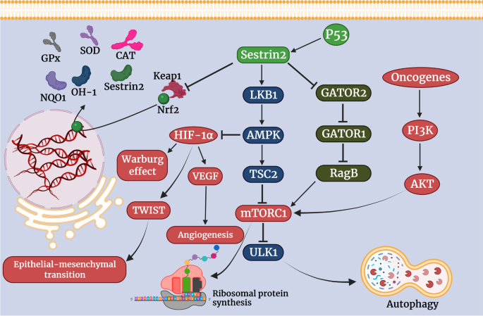 癌症的发生发展与氧化应激、自噬、炎症等细胞过程密切相关。氧化应激是一把“双刃剑”:适度活性氧(ROS)促进癌细胞增殖,过量ROS则诱导凋亡;自噬同样具有双重性,适度自噬帮助癌细胞应对营养缺乏,过量自噬则导致细胞死亡。Sestrin2作为一种保守的抗氧化和代谢调控蛋白,是P53的下游靶基因,可通过调控Nrf2、mTORC1、HIF-1α等关键通路影响癌细胞命运。然而,当前研究中Sestrin2在癌症中的作用存在争议——在结直肠癌中表现为抑癌作用,在肺癌中却可能促进癌细胞存活;其与免疫微环境的相互作用也尚未完全阐明。这些矛盾与未知限制了Sestrin2的临床转化。本综述旨在系统整合Sestrin2与多个信号通路的相互作用,总结其在不同癌症中的双重角色,为Sestrin2作为预后Biomarker及治疗靶点提供理论基础。