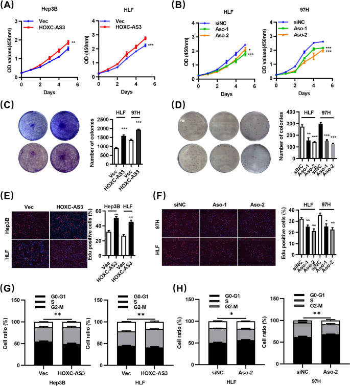 方法细节:①通过反义寡核苷酸(Antisense oligonucleotide, Aso)敲低HLF、97H细胞中的HOXC-AS3(Aso-1、Aso-2),或通过慢病毒过表达Hep3B、HLF细胞中的HOXC-AS3;②采用细胞计数试剂盒-8(Cell Counting Kit-8, CCK-8)检测细胞活力(0、24、48、72小时测450nm吸光度);③集落形成实验检测细胞克隆能力(接种2000细胞/孔,培养14天);④5-乙炔基-2′-脱氧尿苷(5-ethynyl-2′-deoxyuridine, EdU)掺入实验检测S期细胞比例;⑤流式细胞术检测细胞周期分布(75%乙醇固定,DNA Prep染色)。